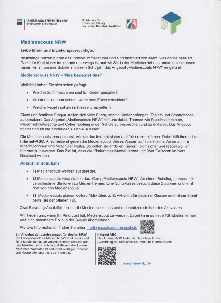 Wir wollen jedoch nicht nur beobachten, wir wollen auch mit pädagogischen Mitteln darauf reagieren. So kam es zum Beschluss „Medienscouts – wir sind dabei“. Was die Medienscouts genau sind, ist im Schreiben unten gut nachzulesen.